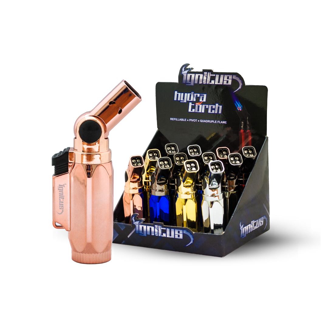 The Ignitus Hydra Torch is built for power, precision, and versatility. Featuring a sleek chrome body, a pivoting head, and a quad flame output, it delivers serious heat with total control. Designed for reliable everyday performance in a durable, easy to handle form.